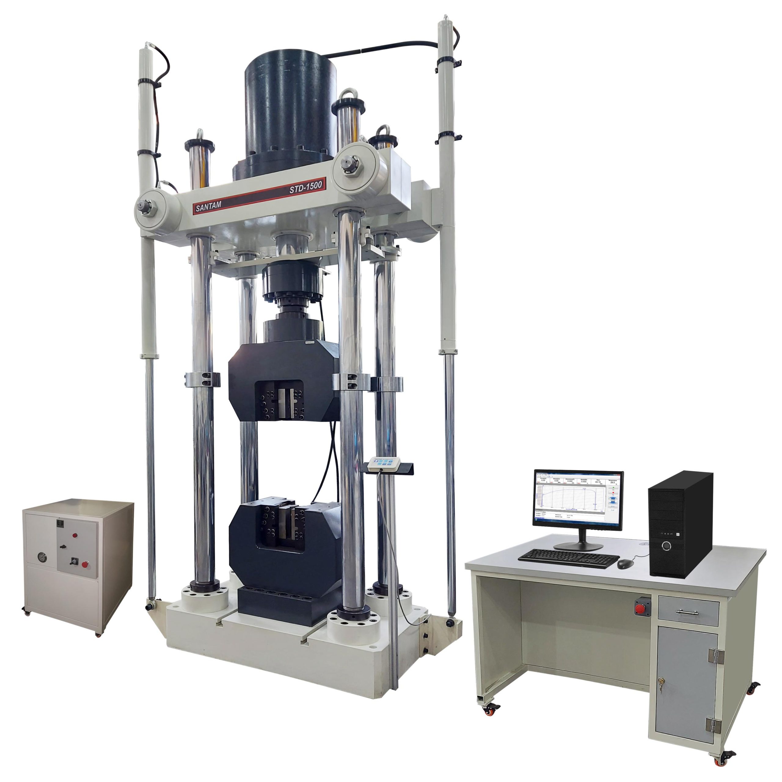 دستگاه کشش 150 تن مدل STD-1500 با جک های جانبی و میز T-Slot جهت تست های کشش، فشار، خمش و … انواع مواد فلزی با ابعاد استاندارد و قطعاتی با ابعاد بزرگ تر از شرایط استاندارد دارد ، قابلیت نصب انواع فک های کششی ( WG, Lateral ) با گیرش هیدرولیک و همچنین فیکسچر های خاص ، فک های فشاری و خمشی را داشته ، که در آزمایشگاههای کنترل کیفی در صنعت و مراکز تحقیقاتی و دانشگاهی و همچنین آزمایشگاههای خدمات تست مورد استفاده قرار گرفته است ، دستگاه قادر است خواص مکانیکی طیف وسیعی از مواد را تست نماید .